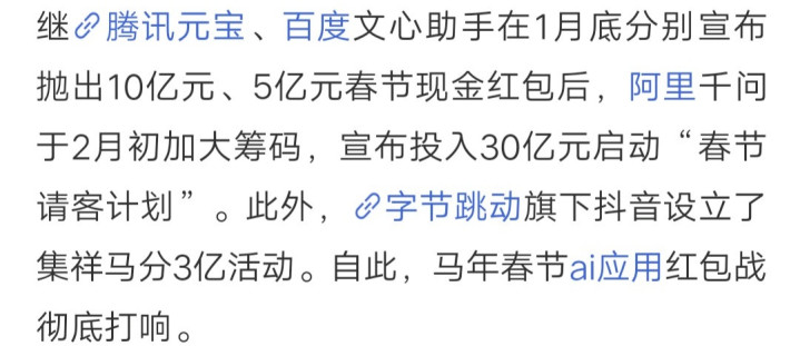 市场对腾讯最大的预期,是人工智能业务。为了抢占AI入口,腾讯元宝宣布,10亿元春节现金红包拉新用户。还有百度文心助手砸5亿,阿里千问投入30亿,字节旗下抖音投入3亿,竞争相当激烈。