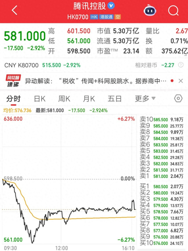 港股周二发生罕见一幕,腾讯控股开盘后,股价快速跳水,盘中最大跌幅超过6%。此后股价有所回升,收盘跌幅2.92%。全天成交额375.62亿港元,量能明显放大,属于爆量下跌。